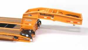 The gooseneck of the Rogers trailer can be coupled to the fully functional fifth wheel which slides along the truck chassis and has a working king pin connection bracket which is activated by moving the handle, just like on the full sized truck. The coiled service lines have connectors which fit into the holes in the gooseneck but they are not a stiff enough fit to remain in place.