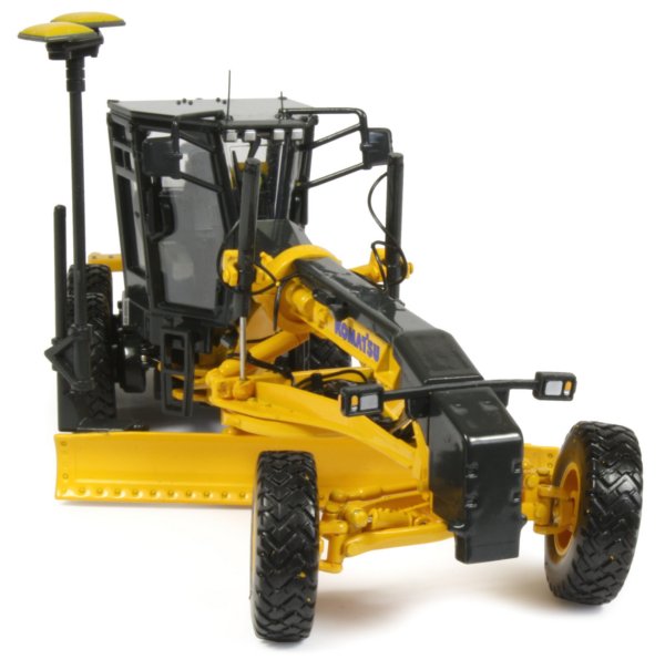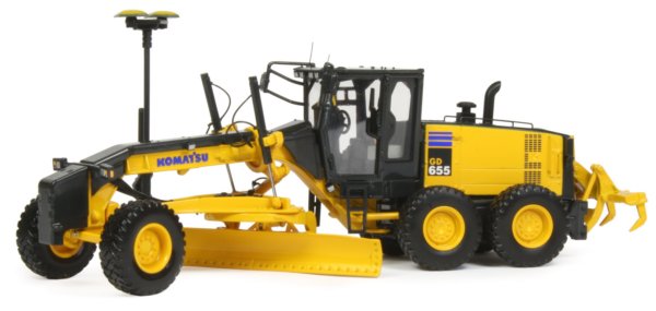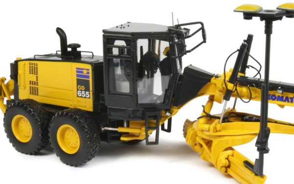 Presented here is the Komatsu GD655-5 motor grader model in 1:50th scale from First Gear, an update to the earlier GD655 model with new castings and an updated decoration. The most noticable difference over the original is the Topcon mast fitted to the blade with a matching display panel located inside the cabin.