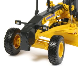 The front wheel assembly is once again engineered to offer a very good range of steering movement and the wheels can be angled just like the real machine, topped with rubber tyres that have a good crisp tread pattern. The paint finish is of a high standard with the Komatsu markings and machine designation located on the sides of the engine housing. The fine printing of the side cooling grills are particularly effective and the model is pictured below alongside the updated snow plow version of the GD655-5 model.