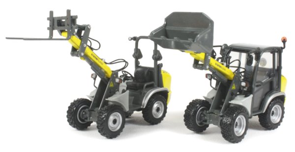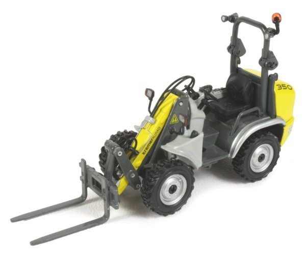 Presented here is the 1:50th scale Kramer Allrad 350 wheel loader with pallet forks from Universal Hobbies. Two versions of the 350 mini-loader have been produced, one with enclosed cab and bucket and the open ROPs and pallet fork version reviewed here.