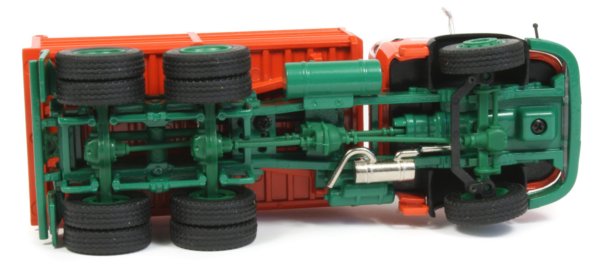The underside of the model displays plenty of detail, from the suspension arms with floating rear axles allowing some degree of suspension movement and the driveshafts fitted from the front and rear axles to the distribution block which is then coupled to the gearbox housing. The front axle moulding houses the front drive hub with linked steering which has a good range of movement. The chromed exhaust silencer box is mounted below the frame with piping from the engine compartment and a curved tailpipe.