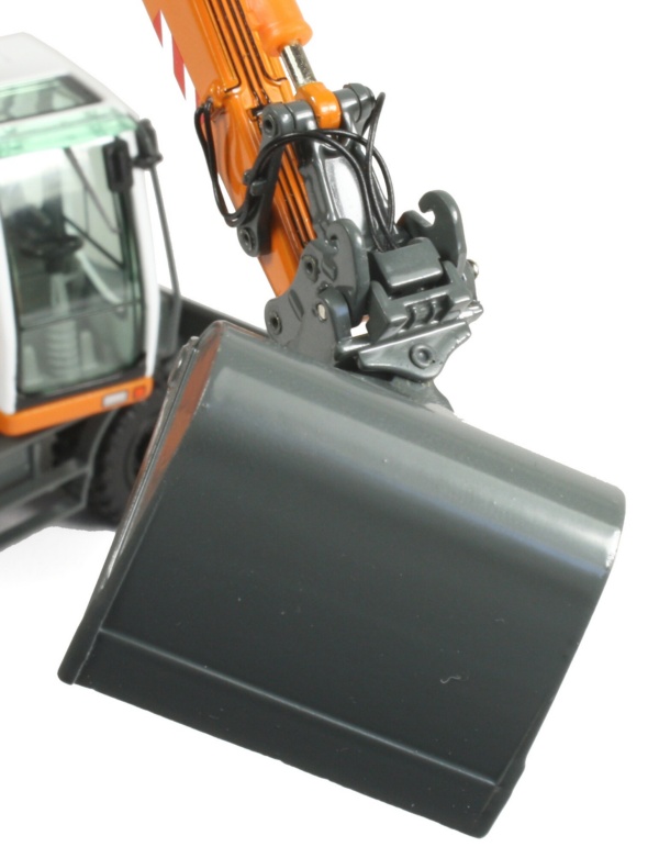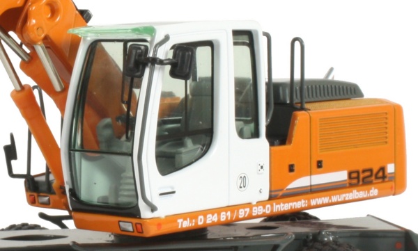 The paint finish is exceptional with the orange and grey colours an interesting change to the normal Liebherr yellow with accurate placement of the Liebherr markings and machine designation on the body sides along with the Wurzel-Bau logo printed on the boom along with the companies contact details along the bottom edge of the body.