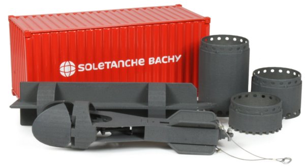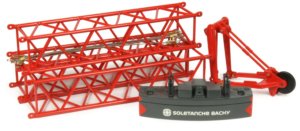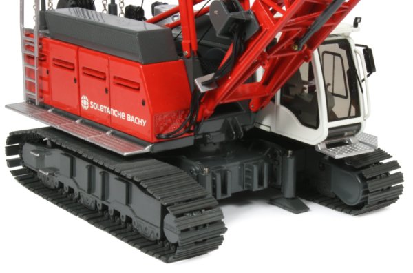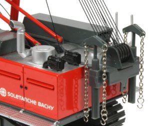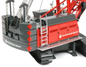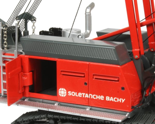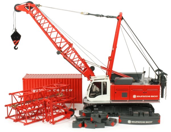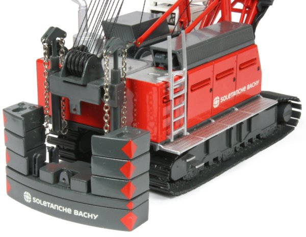 The HS855 duty cycle crane can perform a number of different tasks from lifting to material handling, demolition, soil compaction and foundation applications with diaphragm wall grabs or casing oscillators. The crane is powered by a 600hp diesel engine with an operational weight of 84.4 ton and a maximum lift capacity of 90 ton. The maintenance free Liebherr free-fall winches with integrated drive and disc brakes are powerful and robust with electro-hydraulic control systems allowing smooth and precise control whilst the removable track frames and ballast systems allow easy transport to the work site and the 1:50th scale model presented here from NZG has authentically captured all the details and functionality of the full sized machine, finished in the Soletanche Bachy company decoration.