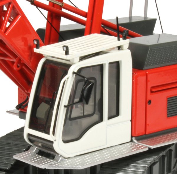 The cab has large glazed windows allowing the detailed interior to be seen, complete with contoured seat, joystick controls and control console. The cab tilts up to about 30 degrees and has a roof window protection screen with integrated work lights. A rear view mirror and windscreen wiper have been added with silver painted walkways located along both sides of the upper structure and around the cab frame.