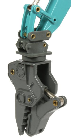 The undercarriage has nicely formed narrow sized linked metal tracks which are tensioned allowing them to remain taut while still rotating smoothly. The model is supplied with a quick couler and two different demolition attachments consisting of a concrete pulverizer and sorting grapple.