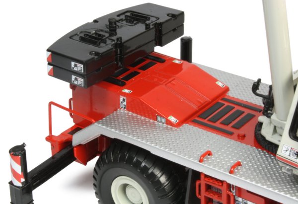 The upper surface of the chassis has painted anti-slip mats with metal safety grab rails on all four corners where access steps are integrated into the bodywork. The rear engine housing has a photo-etch slotted grill with highlighted Link Belt markings while the upper part of the engine has hinged brackets which fold up, allowing the ballast plate to be housed during the self-rigging stage and this works well on the model.