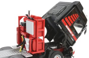 The coiled service lines have been added to the rear of the frame with air tanks, fuel tank and cooling grill all present behind the tilting cab which reveals the modelled engine block at the heart of the chassis.
