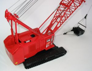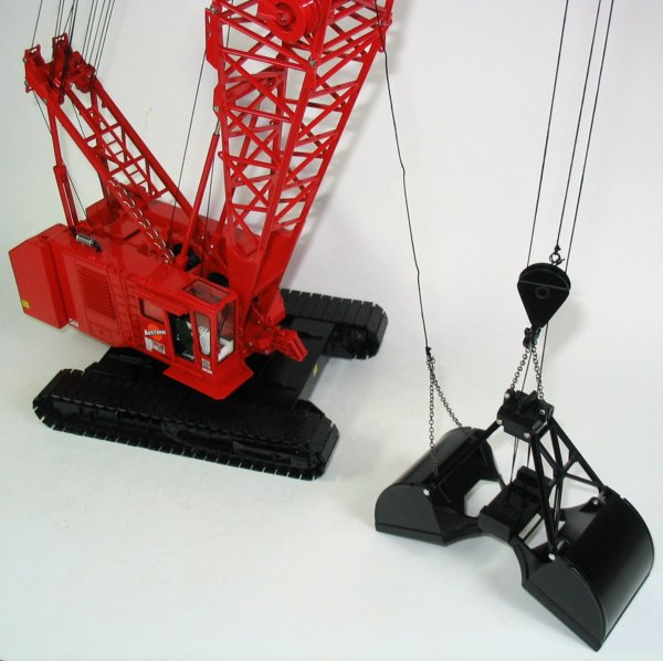 Changing from the magnet to clamshell version is relatively straight forward requiring only to disconnect the tag line and electrical cable and remove the generator assembly from the rear counterweight. The dragline version requires a different boom configuration so it is advised to decide which work attachment you want to use on the model before assembly.