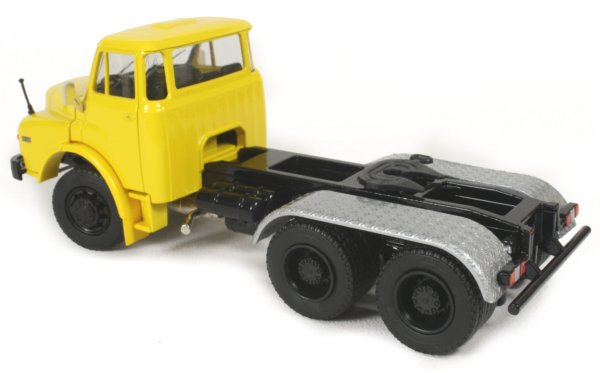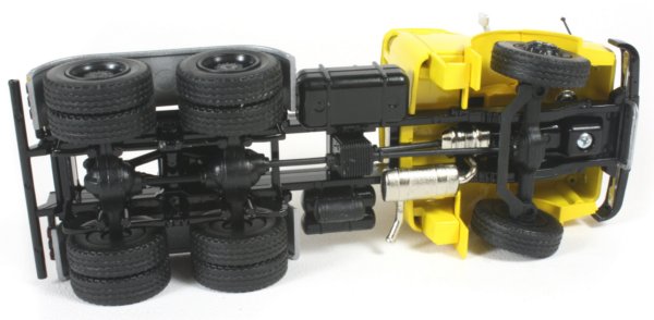 The front axle has working steering which achieves a good degree of turn and the rubber tyres fitted to the plastic wheel hubs have an authentic moulded tread pattern. The rear axles float within the replicated suspension arms giving a little oscilation and the drivetrain is replicated from the engine block through the distribution gearbox to both front and rear axles with fuel and air tanks mounted to the chassis along with a silver exhaust.