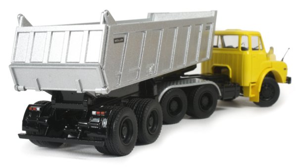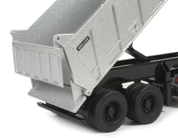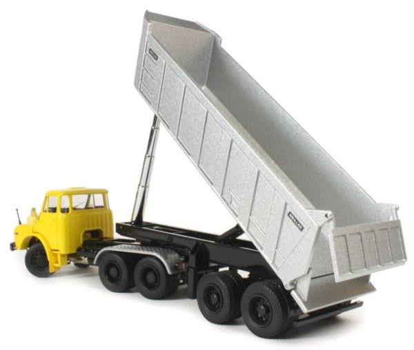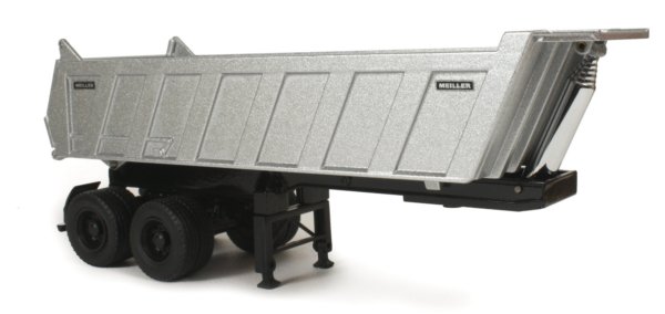 The Meiller tipping trailer is based on a two axle trailer chassis with folding stabilisers fitted into the frame with the two axles mounted to a pivoting suspension bar allowing a little movement. The metal wheel guards have integrated light bars with painted lenses and the rubber tyres have an authentic tread pattern.