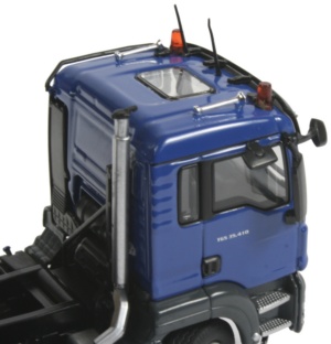 Starting with the cab, The doors have shaped handles with rear view, offside and front safety mirrors fixed to the frame. The cab has a roof window allowing light into the cab to highlight the internal detailing with chromed air horns, amber beacons and two radio aerials fitted to the roof.