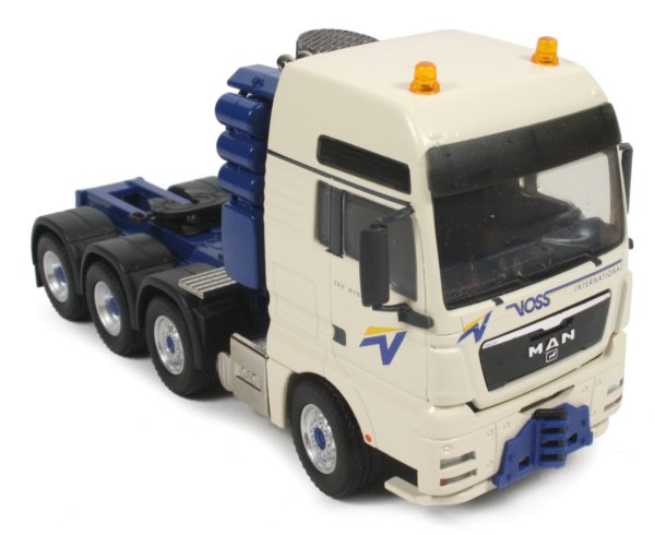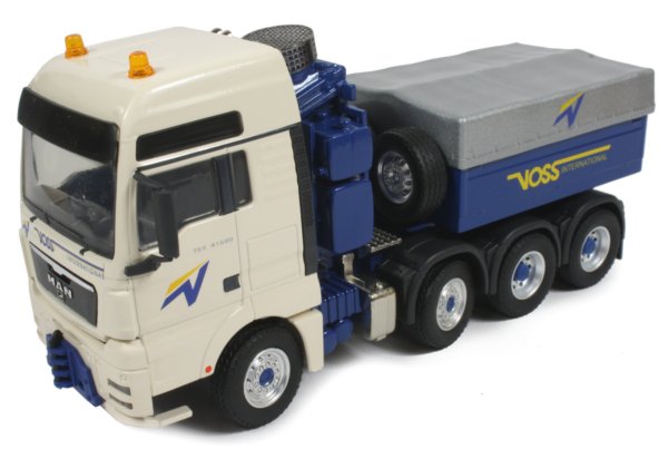 Presented here is the 1:50th scale MAN TGS XXL prime mover in Voss decoration from Conrad which features a tilting cab revealing the engine block at the heart of the chassis. The cab's side panels have accurate panel detailing with amber warning beacons mounted to the roof and self-fit rear view mirrors.