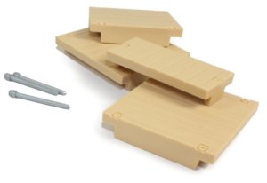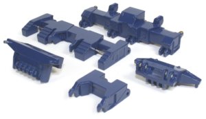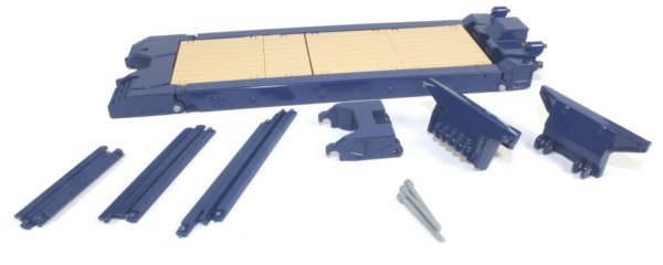 The main beam sections are pinned into place. Here, the collector can decide on the configuration of the trailer. One option is to construct a narrow bed trailer by connecting the beams into the narrow adaptors which then pin into place on the trailer modules (Pictured above). The second option is to place the plastic deck sections to create a more standard looking trailer, with the front section having ridges where a vehicle can be loaded onto the trailer frame. This then connects to the bar of the front adaptor which pins onto the front module.