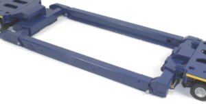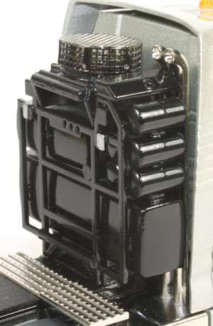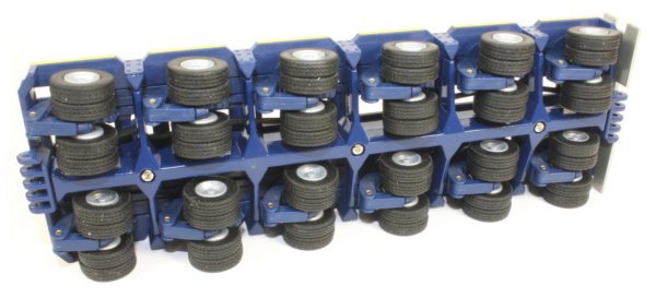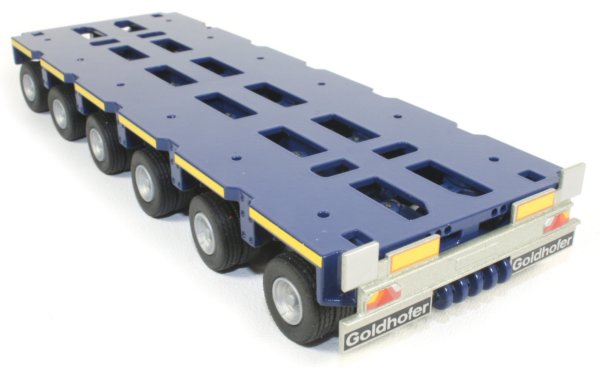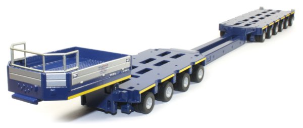 Plastic support bars of three different lengths are supplied allowing the vessel carrier to remain rigid. These bars clip into the holes on the inner lip of the beams. The modules consist of a single four axle and a single six axle unit with good detailing of the frame and independent working suspension of each axle. The wheels rotate freely with an accurate moulded tread pattern on the tyres and plastic silver wheel hubs. The gooseneck has an upper storage area with diamond plate patterned flooring and accurately scaled safety railings with stiff hydraulics allowing the ange of the neck to be adjusted. Controls have been printed on the side of the gooseneck and a yellow stripe is painted along the sides of the neck and modules.