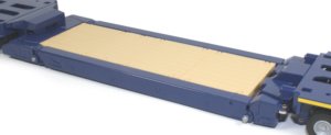 Pictured above, the trailer is set up with a narrow bed, a perfect trailer for transporting tracked construction equipment. Another option is to link the modules together to present a heavy transport trailer, as pictured below. The MAN TGX XXL SLT prime mover supplied with the trailer is nicely detailed with a tilting cab that reveals the engine block at the heart of the chassis. The side panels have accurate panel detailing with amber warning beacons mounted to the roof and chromed air horns on the side. The front bumper has integrated driving lights with clear and amber tinted plastic lenses along with a front towing frame with removable bar. The cab interior has been replicated and is visible through the front and side windows with plastic inserts above the cab doors and the prominent raised MAN name and logo across the front body panel.