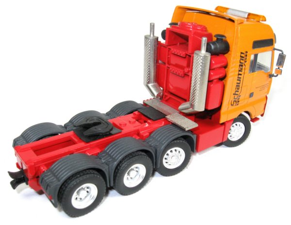 The realistic road treaded tyres are fitted to highly detailed plastic wheels with dark grey plastic guards mounted above the rear wheels. Both the front and second axle have a linked steering system but the amount of steer movement is limited. The paint finish is excellent with printed Schaumann logos on the cab sides and ballast box.