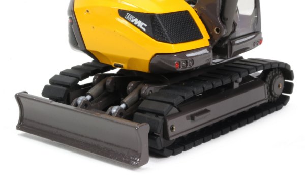 The track frames have good surface engraving detail with running drive and idler allowing the flexible rubber track bands to rotate. A blade is incorporated into the design, complete with protective covers over the hydraulic cylinders.