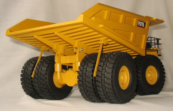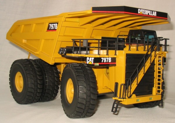 1:50th Scale Caterpillar 797B Mining Truck This is the Caterpillar 797B Mining Truck model from NZG. The model is well made for it's size with many of the details found on the real machine. The model features working suspension and steering and has a fully detailed cab. This is another good model from NZG. It is not as detailed as the Liebherr T282B model and is about the same physical size. the paint finish is good and the decals are authentically reproduced