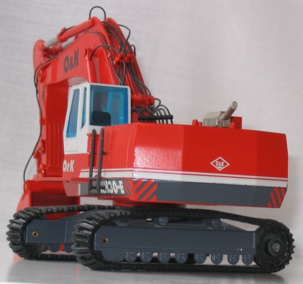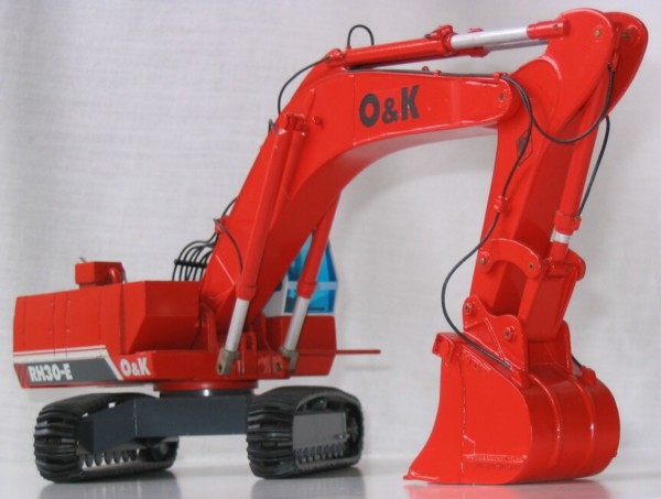 1:50th Scale O&K RH30E Backhoe Excavator This is the O&K RH30E backhoe model. It is a custom model based on the NZG RH30E shovel. The boom, stick and bucket are from a kit by MEC. The model is very well detailed with full hydraulic hose parts and a HDT digging bucket with 3 special teeth that vibrate at the machine digs into the rock face. The model was constructed a couple of years ago and was a challenge to build, as I had not done too many custom models at that stage. The results were very encouraging and I am really happy with how the model turned out.