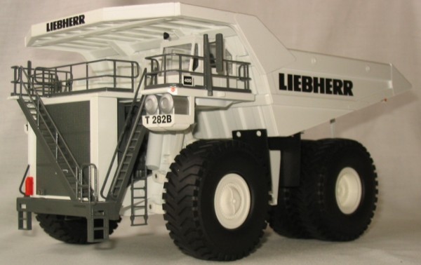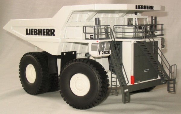 This is the Liebherr T282B Mining Truck model from Conrad. The model is the second Liebherr mining truck model that they have had made. The model is exceptional for it's size with many of the details found on the real machine. The engine has been reproduced along with the exhaust. The model features working suspension and steering and has a fully detailed cab. The model has all the walkways fitted, including ladders to gain access to the engine compartment. This is, in my opinion, the best scale model mining truck produced so far and is another example of Conrad's ability to produce some fantastic models.
