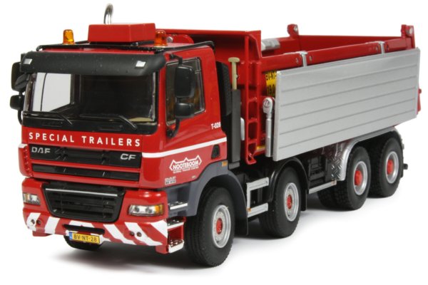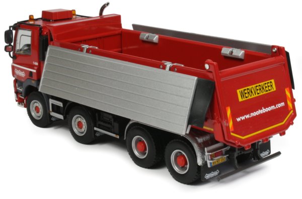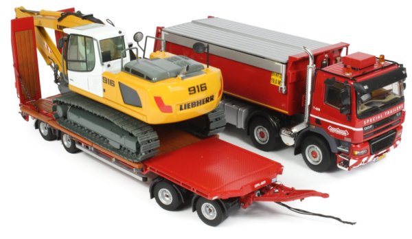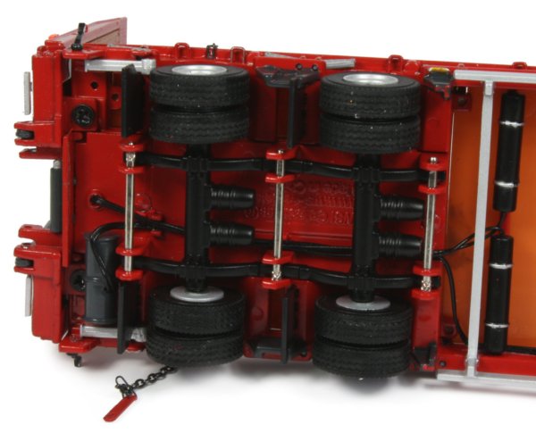 The DAF tipper is decorated in the Nooteboom house colours with white printing of the Nooteboom logos. The front steering is functional with a limited range of steering movement and the cabin tilts forward to reveal the modelled power-plant beneath. Attention to detail is excellent with a fully replicated underside including drive-train and suspension detailing.