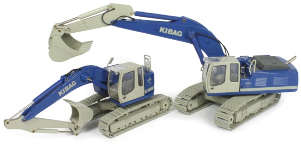. The narrow trenching bucket has been implemented well with good tooth and wear detailing while the boom and stick have a very good range of movement, allowing the bucket to fit within the undercarriage footprint. The finish of the model is excellent, as is expected of Conrad with an authentic blue and light grey colour scheme with crisp printing of the Kibag name and logos, pictured below alongside the Liebherr R954C in the same company colours.