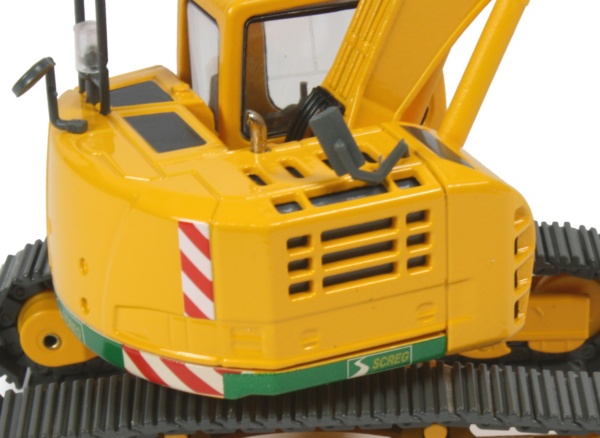 The undercarriage is excellent, with sprung loaded idler wheels and individually linked metal tracks. The bucket is nicely done and has plenty of detail, including wear protection while the boom and stick have a very good range of movement, allowing the bucket to fit within the undercarriage footprint. The finish of the model is excellent, as is expected of Conrad with crisp printing of the Screg construction group graphics on the boom, body and counterweight.