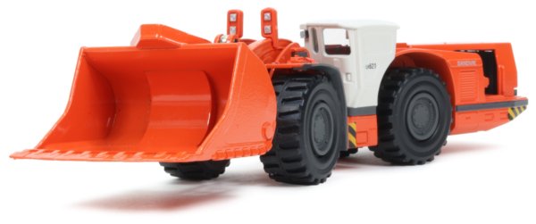 The Sandvik LH621 model in 1:50th scale was first introduced in 2008 and has recently been re-released by Conrad with updated markings. The side mounted cab is painted white with small windows on three sides giving a good degree of visibility to the work area. The cab interior has been replicated and you can see the seat and controls within.