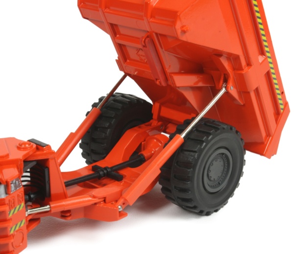 The body lifts to a very good height while the articulating frame offers a good amount of steering movement with the front axle pivoting to simulate the suspension mechanisms of the truck. The large tyres have a deep moulded tread pattern which looks authentic with plastic wheel hubs showing all the fixing bolt detailing.