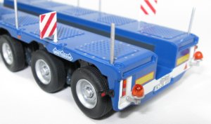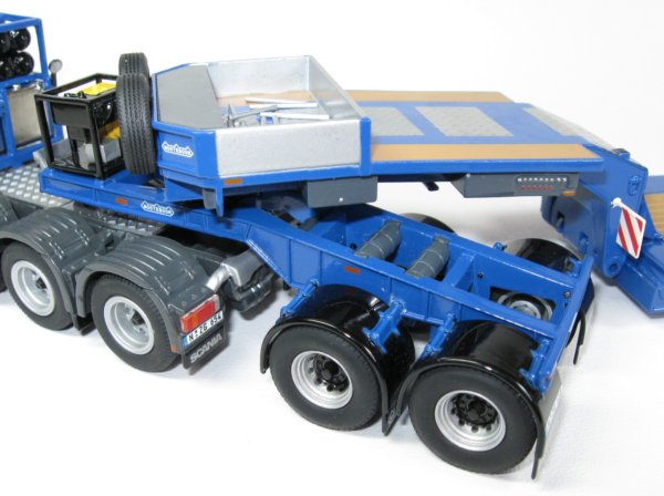 Presented here is the 1:50th scale Scania R 8x4 prime mover with Nooteboom 2-axle dolly and 5-axle Pendel X trailer from NZG.