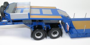 The design of the rear section of the trailer is interesting with the five axles mounted to the framework on each side allowing the centre to be at the same height as the trailer bed. This is useful when transporting excavators where the stick can be lowered into the space between the rear axles to reduce the height and the model has captured these details well with each of the axles having working suspension along with a linked steering bar which gives a good amount of steering before the tyres contact with the frame.