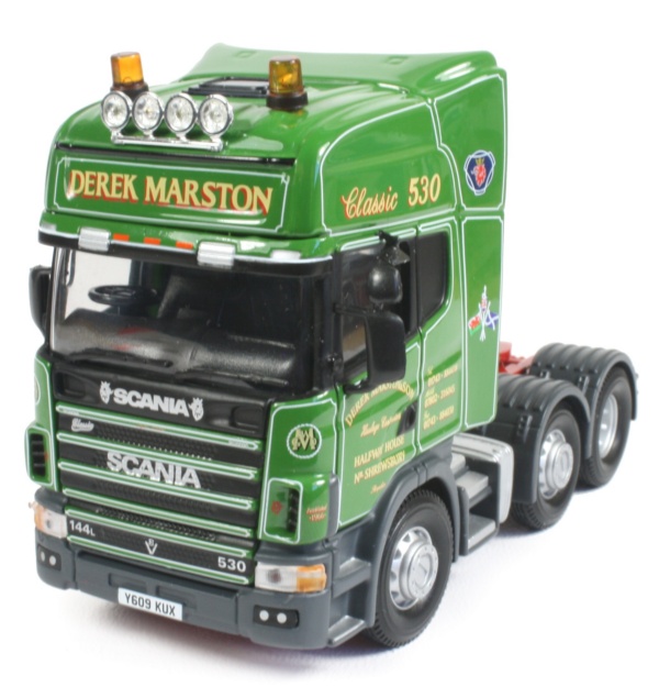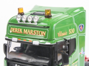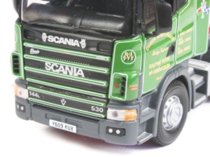 The front of the cab has some intricate grill texturing which looks good with accurate printing of the company design and Scania logos. Clear and amber tinted lenses have been added along with an accurate numberplate. |