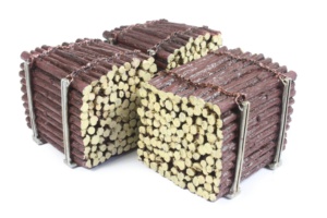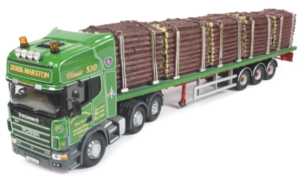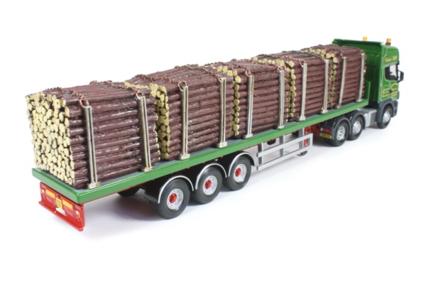 The three axle flat bed trailer is reasonably detailed with side safety frames, rotating wheels which have silver hubs with red centres and silver highlighted mud guard faces. The cast load supplied with the model consists of five blocks of logs, complete with upright frames and tie-down chain detailing all intricately cast into the surface of the single block. The paint finish adds tone and highlight for added realsim and they certainly look fine. |
