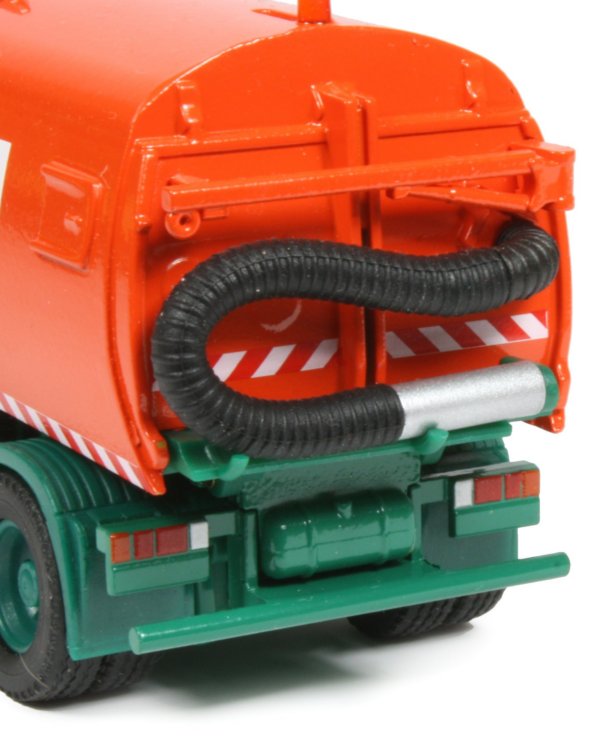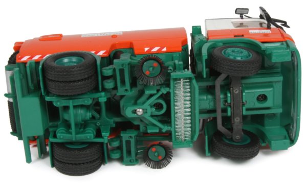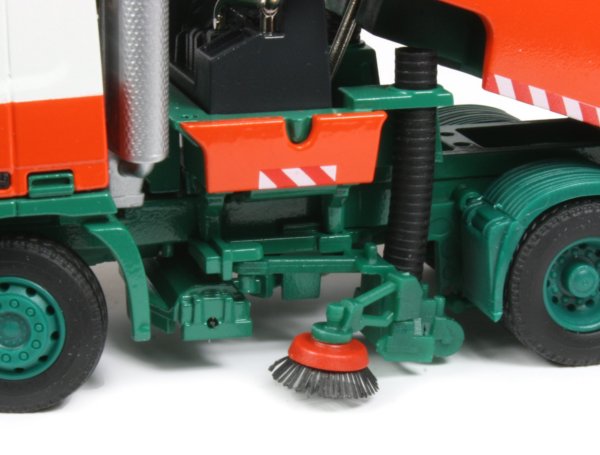 A rotating brush is located on both sides of the chassis, connected to a plastic arm which pivots outward into working mode. The entire frame can be lowered until the rear pick-up housing, complete with simulated roller wheels, touches the ground. The central sweeper brush has been produced with fine scaled bristles which look very authentic and the frame can be angled left or right and can be lifted up into the travel position.