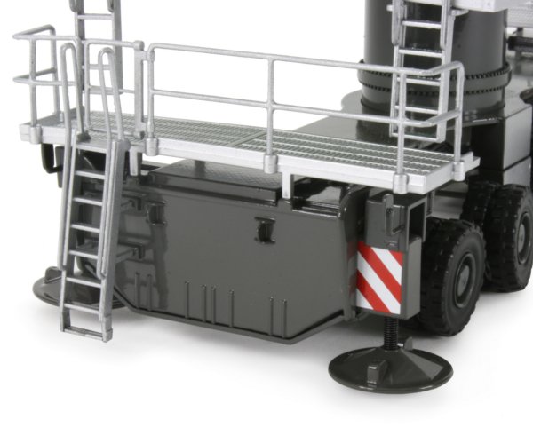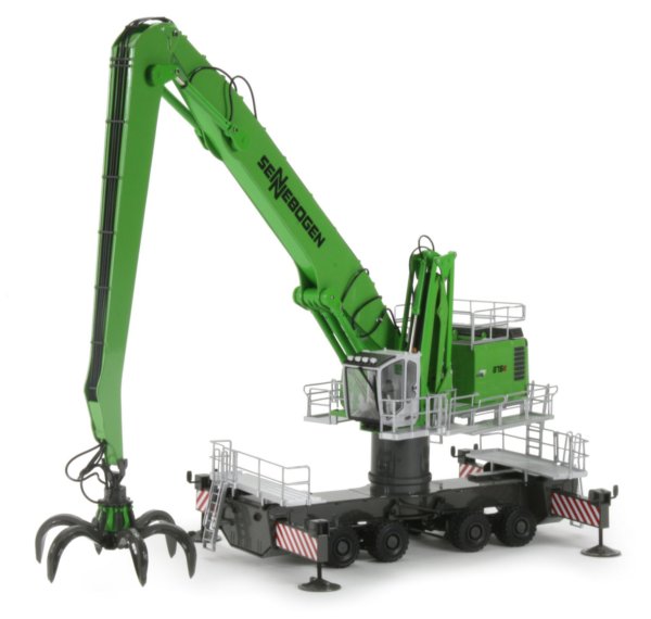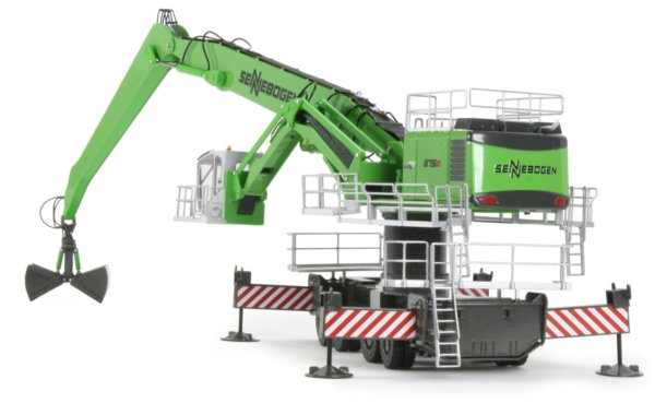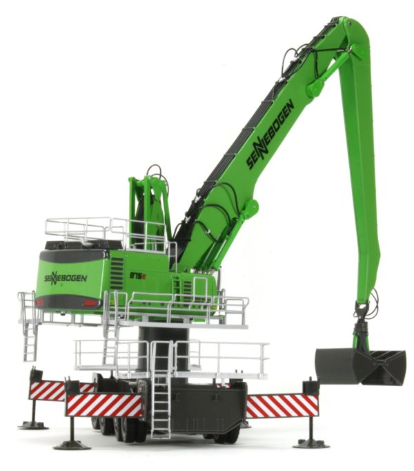 Presented here is the 1:50th scale Sennebogen 875E material handler with MS180 mobile undercarriage which has been produced in China by Ros. The boom, stick, work tools, main body and cabin use the same tooling as the 875E tracked material handler with differences observed with the walkways running along the sides of the upper structure which have access steps to the rear.