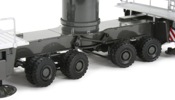 The MS180 wheeled undercarriage has been executed well, with the four axles all having a linked steering system operated by linkage bars on one side of the chassis connected to a central arm which pivots, operating the steering on the axles. The axles are organised in pairs, with each pair connected to bogies which offer some oscillation to simulate the suspension system and while this works, there is a feel that the mechanism is fragile, as is the steering linkage so care needs to be taken. Each rotating wheel hub is fitted with a pair of tyres which have a moulded tread pattern.