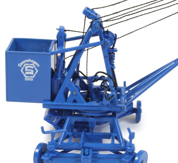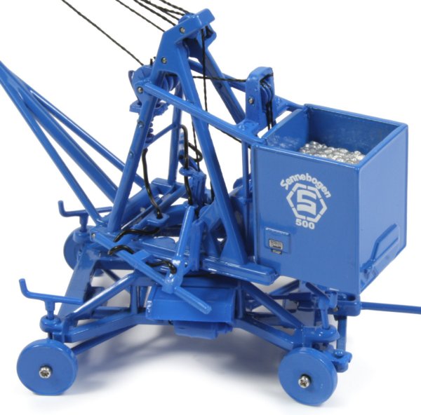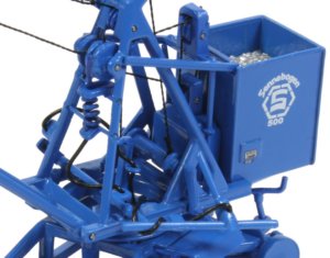 The S 500 features a steel wheeled base with working steering and pivoting towing bar allowing the crane to be easily positioned, a task usually done by a farm tractor. Operation of the crane was electric or by the power take-off of the tractor and there are flexible hoses fitted to the model to simulate the feeds to the winch motors, while a generator housing is located below the turntable, complete with protective cover.