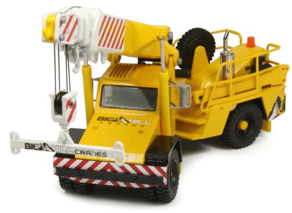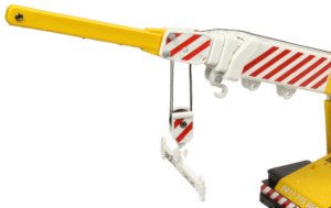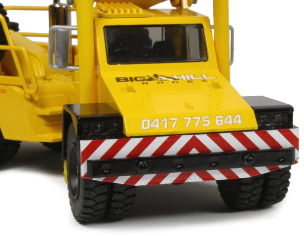 Terex AT20-3 "Franna" Mobile Pick & Carry CraneThe Terex AT20-3 “Franna” pick & carry crane has a lifting capacity of 20 ton at 1.4 metre and a maximum hook height of 17 metres. Unlike conventional cranes, the four section telescopic boom is fixed to the chassis with articulated steering providing an arc of 400 to each side of centre. Powered by a Mercedes OM 906 Euromot 3a turbo charged diesel engine, the crane has a top travel speed of 85kph using an Allison 3000 6-speed automatic transmission and heavy duty Kessler D71 planetary axles, while tipping the scales at 19500kg. The 1:50th scale replica by Conrad has captured the rather unique looks of the full sized crane very well with an articulated chassis which provides the steering and positioning for lifting operations although there are no steering cylinders fitted to the model. The front wheel covers have integrated light housings although the lenses are unpainted and are hard to distinguish which gives the front of the model an unfinished look. A red and white chevron pattern is printed along the front of the chassis. The rear of the model features the engine housing with metal safety railings and a rear storage area for the extension jib which can be set at two different angles when connected to the boom. It is also possible to connect an auxiliary lifting hook to the tip of the boom as required.
