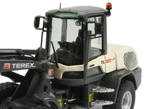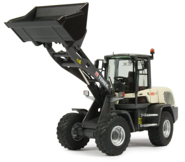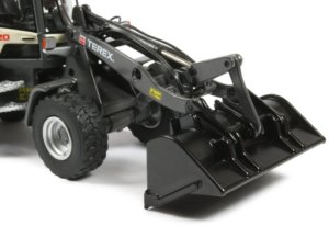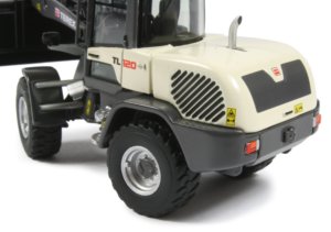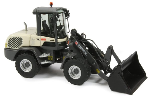 Presented here is the 1:50th scale Terex TL120 wheel loader which has been produced in China by NZG. The TL120 is the largest model in the Terex compact wheel loader line, tipping the scales around 7 ton with a bucket capacity ranging from 1.2 to 1.8m3 with a transverse mounted Deutz 4-cylinder turbocharged diesel engine delivering 100hp. The independent hydrostatic transmission and 2 speed ranges allow for a top travel speed of 20km/h while an optional ‘high speed’ derivative offers up to 36km/h.