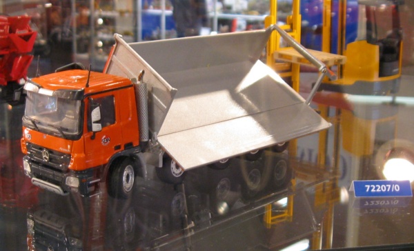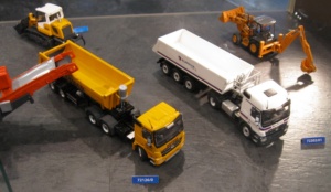 Historic models from Conrad include the Hamm 1911 diesel engined road roller which has been painted in a light green colour and the MAN DHAK 3-axle truck with tipping rock body which was launched at the end of last year. These are joined by the new Mercedes Benz LAC 3-axle truck which is available in an orange paint colour and follows on from the green version which is already sold out. For crane fans, the release of the updated Terex AC100/4L was a welcomed addition with a rather interesting decoration scheme which takes a little getting used to. For Felbermayr fans, a limited edition version of the model is also planned and centre stage, the prototype of the Terex AC1000-9 was once again displayed which is likely to go into production later this year once the full sized crane is finally launched. (Here's hoping) The Liebherr LR1750 SLH tracked crawler in Wiesbauer decoration was displayed alongside a version with back mast and suspended counterweight tray which looked very impressive. It is currently not confirmed which version of the model is actually going into production but i suspect it will be the standard version of the crane with the possibility of an add-on kit to upgrade to the heavy lift version. A full listing of all the new Conrad models has been uploaded to the Conrad News page. Last year, NZG only had a couple of new models with most of their announcements consisting of company painted releases. This year, they have added the Dynapac brand to their range with the release of three paver models which are highly detailed, as expected from NZG. Paving fans will also be happy to see the release of the Voegele MT3000-2 offset feeder which is the perfect companion to the range of wheeled and tracked pavers already produced. The highlight for me are the three new Liebherr models which are coming along nicely. The A918 compact has been rumoured for over a year and the model looks great, although the final version will have yellow hydraulics instead of the grey ones shown on the prototype. The R936C is a big brother of the R916 and features the same updated body styling with a quick coupler, removable bucket, linked tracks and a replicated cab interior. When I heard the rumours surrounding the release of a Liebherr SR714 welding tractor model, i was praying they were true as the SR714 is the perfect partner to the range of pipe layer models already released and the result from NZG is very encouraging, with a functioning Hiab crane, linked tracks and accurately modelled rear housing for the welding kit, the model is actually larger than I expected. It is certain that NZG will have other new releases this year with plenty of rumours still standing and they have confirmed they are busy working on new models for Bauma so there are still plenty or surprises throughout the year. Joining the new construction models are a number of company painted releases including new releases in the R916 range along with a new series of limited edition company painted models featuring the Volvo EC460 tracked excavator while three new versions of the Hitachi ZX1000 are looking very smart indeed. Crane fans will be pleased with the release of two more versions of the Liebherr LTM11200-9.1, accurately decorated in Roxu and Senn AG liveries while the updated version of the Terex AC200-1 and the limited edition Merkel version are also due soon. The new Mercedes FH23 and FH25 trucks were displayed and the new body styling looks very interesting. The models will be release with different trailer configurations including box, curtainsider and container with a 3-axle rigid truck with swappable body and a towed trailer version also being produced. A full listing of all the new NZG models has been uploaded to the NZG News page.