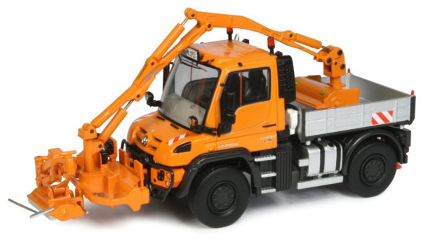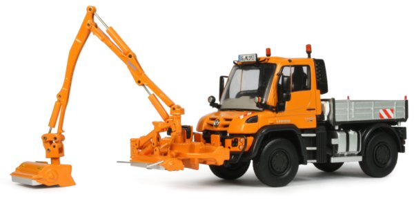 Presented here is the Mercedes Benz Unimog U430 with a Mulag MKM700 combination mower in 1:50th scale from NZG. The Mulag MKM 700 combination mower is the perfect companion for the 400 series Unimog, powered from the vehicle’s front PTO and capable of mowing verges at the sides of highways with the boom mounted cutter head and low mounted verge cutter.