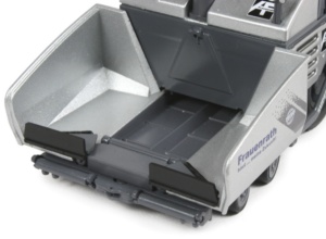 The ErgoPlus control system controls are mounted on each side of the rear spreader and the main control station has a sliding control console which allows the paver to be operated from either side with the prominent steering wheel mounted in the centre of the console. The seats have a swing out motion which gives a better view of the area and there are accurately scaled handrails all round the model.