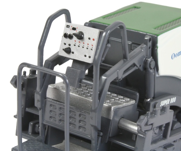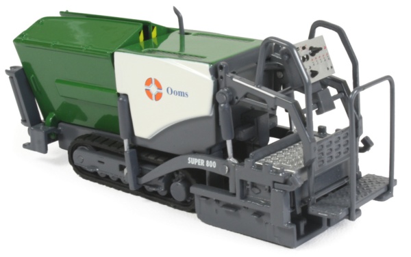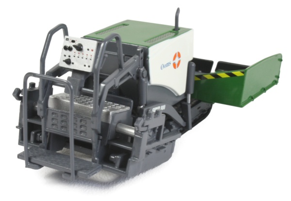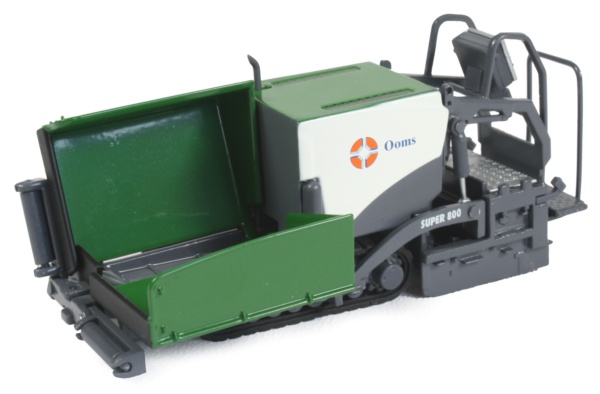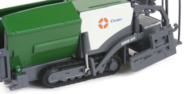 Presented here is the limited edition Vogele Super 800 tracked paver in 1:50th scale from NZG, decorated in the OOMS company colours. The model features a working hopper with each side lifting to the vertical position, along with the wheel guides, complete with rotating rollers. The paver is very narrow and is mainly used for pavement surfacing or in areas with limited access.