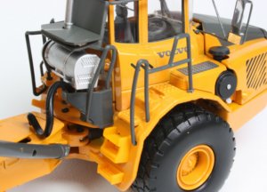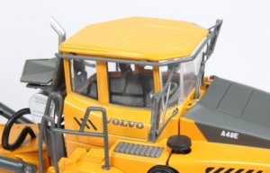 This is a good update to the original model with a crisp paint finish and accurate placement of the Volvo markings. The opening engine cover has been redesigned with the cooling grill pattern at a different angle to the D version along with new work light cutouts and a different grey paint mask on the top of the engine cover making the A40E look a little sharper. There are several differences on the bonnet between the A40E-FS and A40E as seen in the picture below where the cast grills are missing. and the panels on either side of the cab are printed. On the sample reviewed here, the cab frame around the windows is still yellow whereas on the A40E-FS, more of the frame is painted grey, highlighting another small difference. It is interesting that when placed alongside the A40E-FS, the colour of the yellow is much darker, as can be seen in the pictures above and below and it is not clear if Volvo have changed the colours or if the model is the wrong shade when compared to the A40E-FS and A40D.