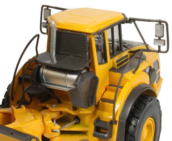 The F series model has an opening engine compartment and fold down front grill, just like the full sized machine. The engine bay is fitted with a fully replicated diesel engine and associated components including air filters, cooling system and exhaust piping. The cab interior has been fully modelled with drivers seat centrally located along with a detailed console and steering wheel. The rear window has mesh screen detailing with a windscreen wiper added to the front window. The rear view mirror assemblies are integrated into the plastic grab rails which extend from the cabin frame and are fairly accurately scaled and look fine. The front windscreen has a fitted wiper and the rear window has a protective plastic screen. The articulating frame has a good angle of movement with two hydraulic cylinders fitted to the steering linkage and the frame can oscillate by about 20 degrees to each side of centre. Access steps are fitted to the rear of both wheel arches with accurately scaled plastic handrails which have a curved shape while the steps have a textured and highlighted upper surface. This is a fair update to the original model with a crisp paint finish and accurate placement of the Volvo markings while the opening engine cover features a different grille shape over the previous versions. It is a shame that the rear axles cannot demonstrate the functional suspension system and the tipping angle of the dump body is surprisingly low (as shown below) considering the length of the hydraulic cylinders. At least the dump rams are metal on this model unlike some of their other recent releases. |