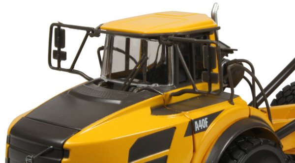 1:50th Scale Volvo A40F Articulated Dump Truck Presented here is the 1:50th scale Volvo A40F articulated dump truck from Motorart. The model is an update to their previous A40E and A40E-FS models with an updated design. The rear chassis features nicely detailed inner wheel hubs and a replicated suspension system along with drive shafts to the axles but unlike on the early A40D ADT model where the suspension can oscillate, on this model it is fixed in place which is a little dissapointing considering the retail price for the model.