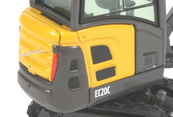 The paint finish is excellent throughout with accurate highlighting of grill panels and crisp markings. The model is packaged in a two piece clear plastic holder which protects the model well. This is inserted into an open front printed cardboard box. The picture below shows the EC20C alongside the ECR48C tracked excavator from Motorart, demonstrating the tiny dimensions of the EC20C.