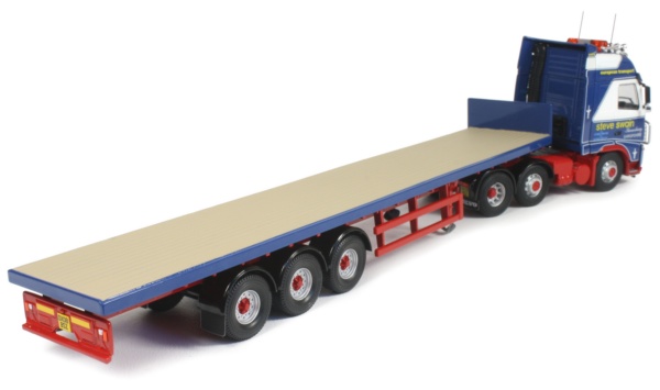 The three axle flat bed trailer is reasonably detailed with side safety frames, rotating wheels which have silver hubs with red centres and silver highlighted mud guard faces.