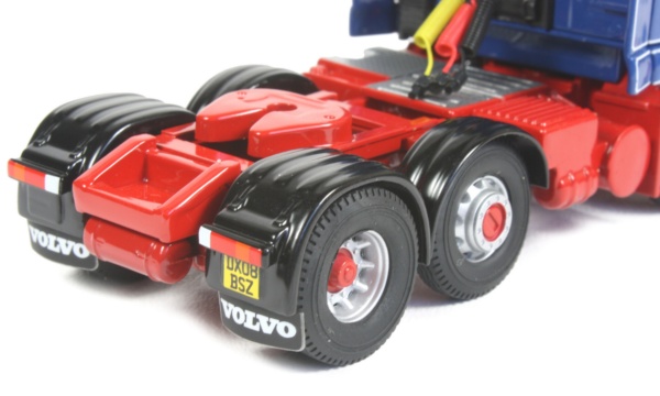 The rear view mirrors need fitting to the model and a touch of glue is recommended to ensure they stay in place. The graphic printing all around the cab is very crisply done, with intricate artwork applied very well and the white pin lines really adding to the realistic appearance. The red and blue livery is certainly striking and there are some additional detailing additions which are new to Corgi, like the flexible plastic flaps below the front bumper which have the Volvo logo printed on them and the protective mesh front screen fitted in front of the grill which looks particularly good (although this was damaged when i opened the box and required a touch of glue)
