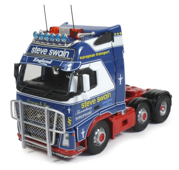Presented here is the 1:50th scale Volvo FH 6x2 tractor with 3-axle flatbed trailer and log load in the livery of Steve Swain Transport Ltd from Corgi. Like most Corgi models, the chassis detail is very basic although this area of the model is often hidden when displayed so this is not much of a problem. One dissapointment is the fixed front axle which prevents the model from being posed with the wheels turning and I always wonder why Corgi cannot add working steering to all their models. The wheel hubs have some good detailing with red centres while the tyres have a realistic looking tread pattern.